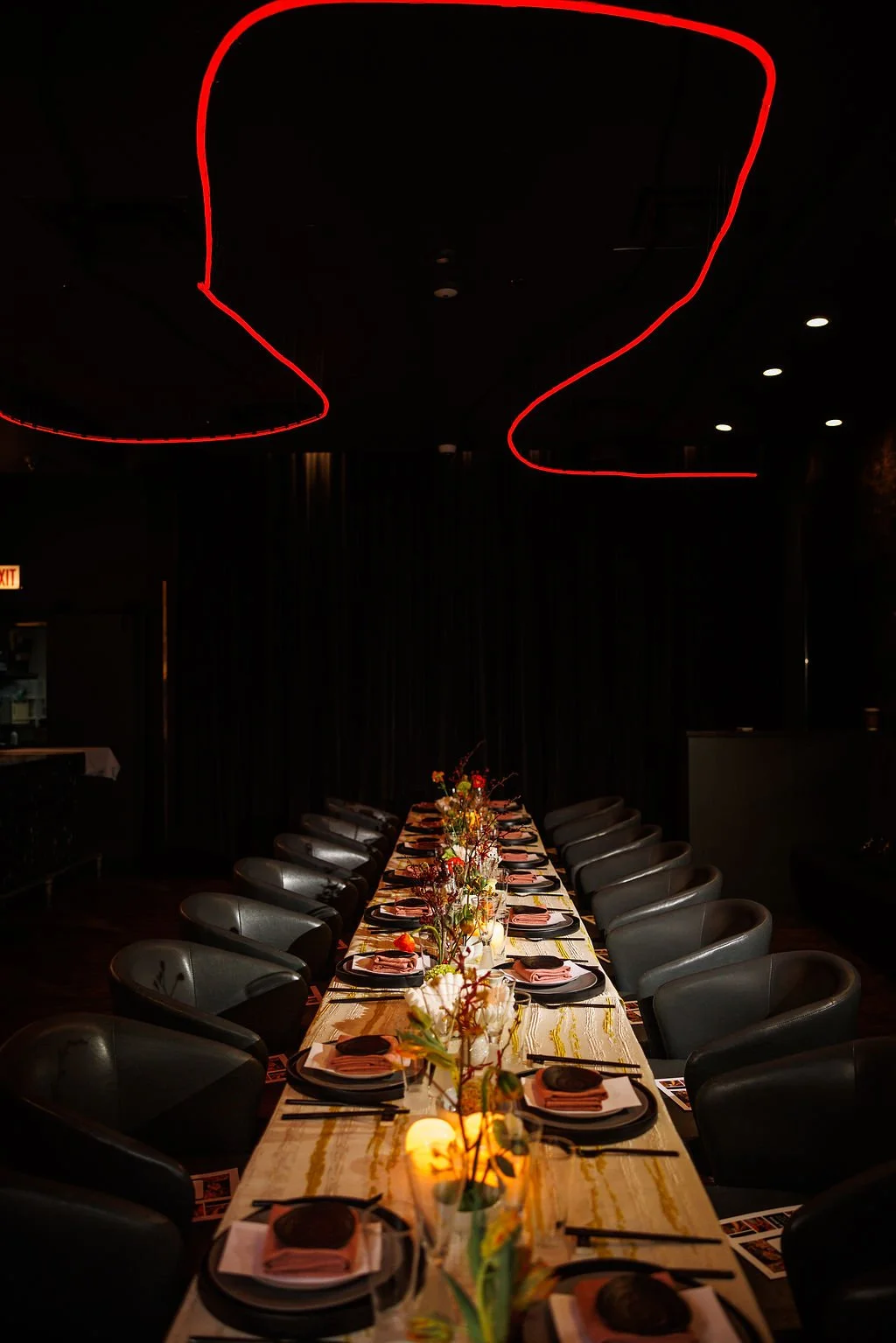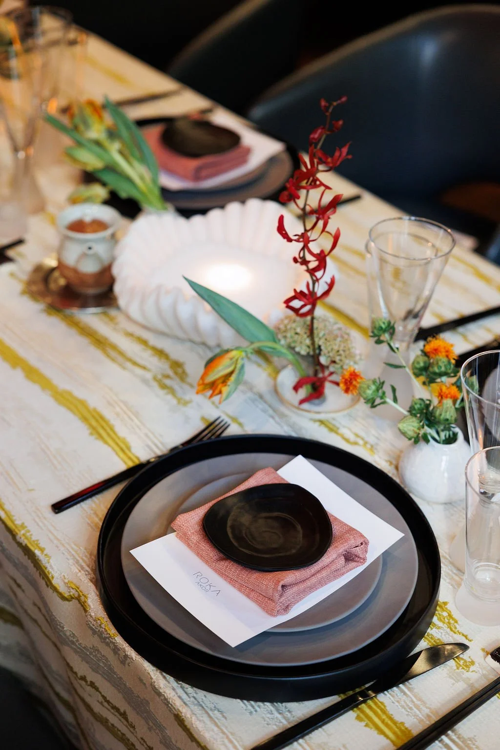 Ikebana style design for private event at Roka Akor Chicago using bright pops of color citrus, chartreuse and minimalist design details that complement venue aesthetic ( photos by JSC photography)
